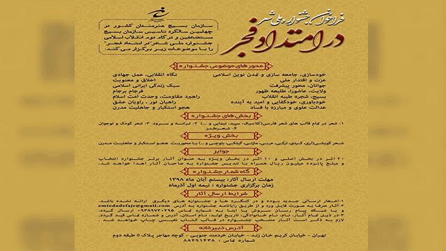 به گزارش آی‌فیلم، سازمان بسیج هنرمندان کشور در چهلمین سالگرد تاسیس سازمان بسیج مستضعفین و در گام دوم انقلاب اسلامی، جشنواره ملی شعر«در امتداد فجر» را با موضوعات زیر برگزار می‌کند: