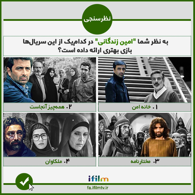 در تازهترین نظرسنجی آیفیلم این سوال مطرح شده که «به نظر شما "امین زندگانی" در کدامیک از این سریالها بازی بهتری را ارائه داده است؟» و گزینههای ارائه شده برای این نظرسنجی عبارتند از: