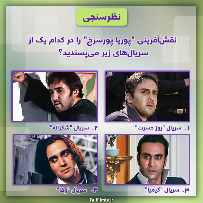 به گزارش آی‌فیلم، نظرسنجی جدید آی‌فیلم فارسی به این سوال اختصاص یافته است که: "نقش‌آفرینی "پوریا پورسرخ" را در کدام یک از سریال‌های زیر می‌پسندید؟"  و گزینه‌های مورد نظر برای این نظرسنجی موارد زیر هستند: