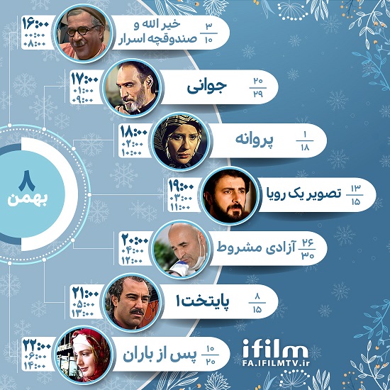 به گزارش آیفیلم، سریالهای «خیرالله و صندوقچه اسرار»، «جوانی»، «پروانه»، «تصویر یک رویا»، «آزادی مشروط»، «پایتخت 1» و «پس از باران» در حال پخش از شبکه آیفیلم هستند که در جدول زیر خواهید دید چند قسمت از این سریالها پخش شده و چند قسمت باقی مانده است.