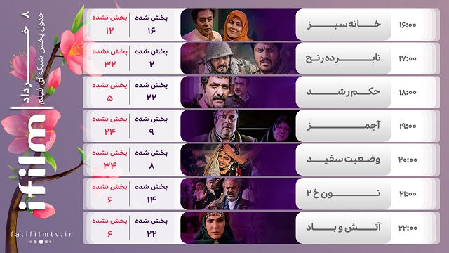 به گزارش آیفیلم، سریالهای «خانه سبز»، «نابرده رنج»، «حکم رشد»، «آچمز»، «وضعیت سفید »، «نون خ ۲» و «آتش و باد» در حال پخش از شبکه آیفیلم هستند که در جدول زیر خواهید دید چند قسمت از این سریالها پخش شده و چند قسمت باقی مانده است :