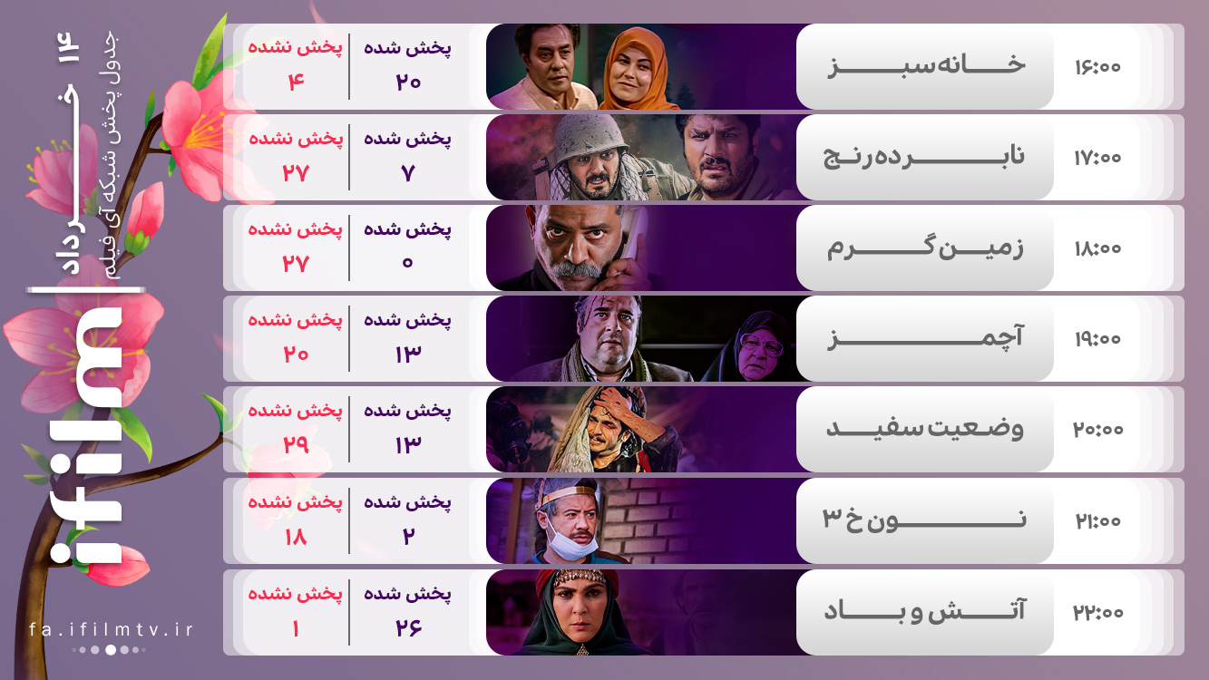 به گزارش آیفیلم، سریالهای «خانه سبز»، «نابرده رنج»، «حکم رشد»، «آچمز»، «وضعیت سفید »، «نون خ ۲» و «آتش و باد» در حال پخش از شبکه آیفیلم هستند که در جدول زیر خواهید دید چند قسمت از این سریالها پخش شده و چند قسمت باقی مانده است :