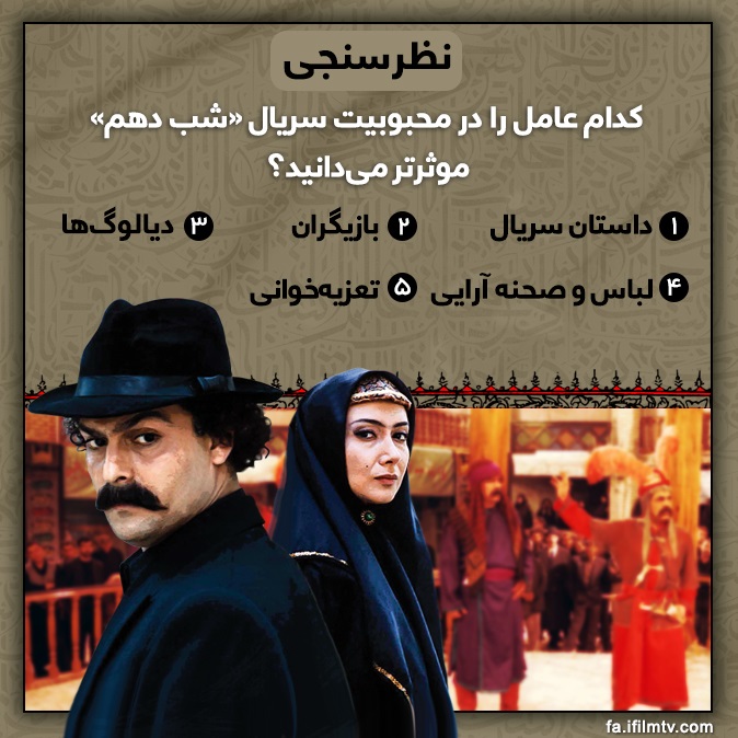 به گزارش خبرنگار شبکه آی‌فیلم، در جدیدترین نظرسنجی آی‌فیلم فارسی پرسیدیم: «کدام عامل را در محبوبیت سریال «شب دهم» موثرتر می‌دانید؟» و گزینه‌های مطرح شده برای این نظرسنجی به ترتیب زیر است: