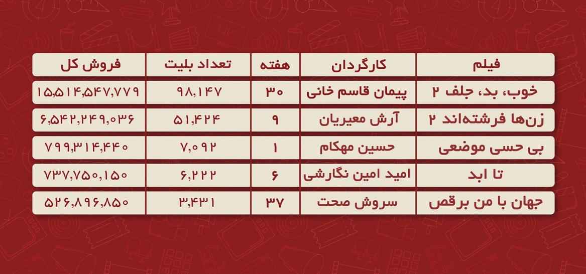 به گزارش آیفیلم، در ابتدای برنامه سینما آیفیلم، طبق روال هفتههای گذشته، آمار فروش فیلمها در سینماهای ایران ارائه میشود. بر اساس این گزارش، فیلم سینمایی «خوب، بد ، جلف ۲» با فروش بیش از یک میلیارد و پانصد و پنجاه میلیون تومان در صدر فهرست فروش فیلمهای سینمایی قرار دارد.