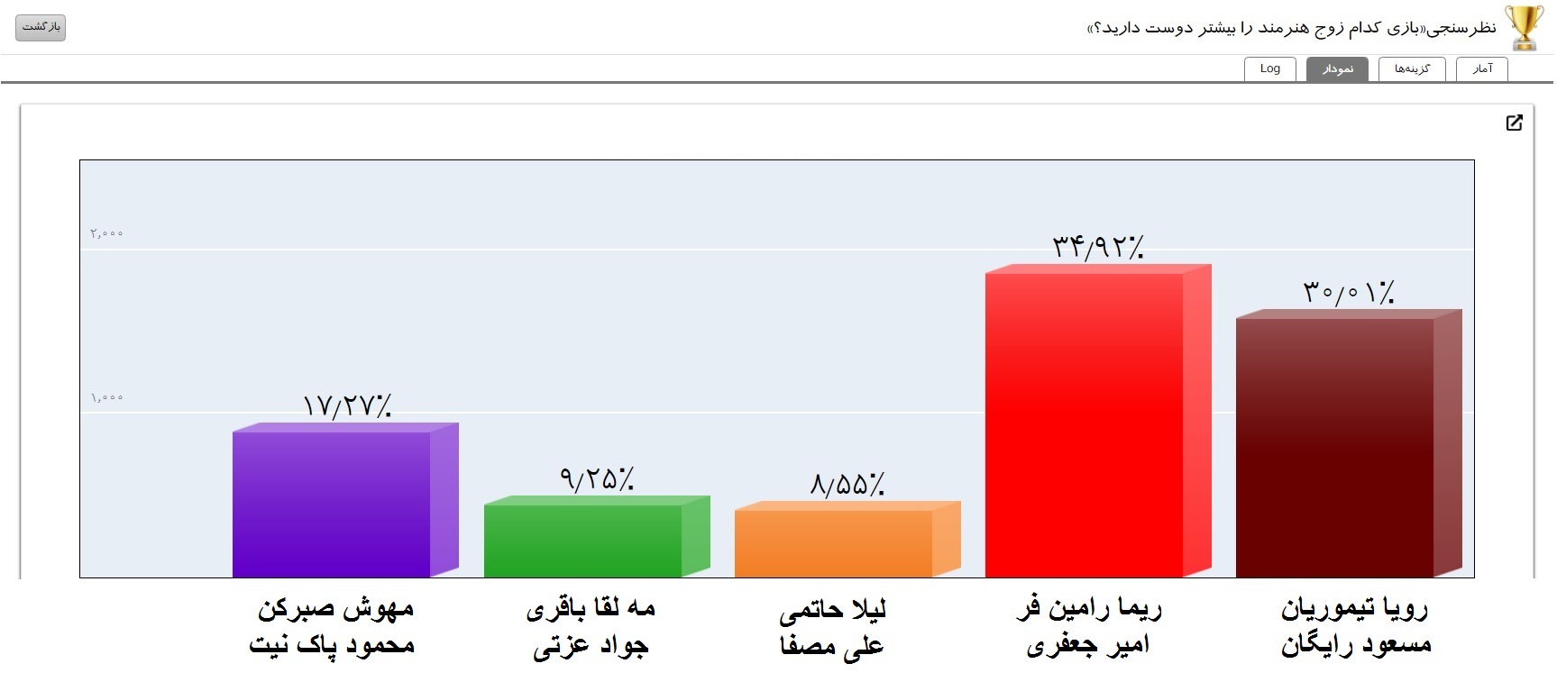 شایان ذکر است نظرسنجی قبلی شبکه آیفیلم با این عنوان منتشر شده بود: «بازی کدام زوج هنرمند را بیشتر دوست دارید؟» و نتایج آن را در تصویر زیر میتوانید ببینید: