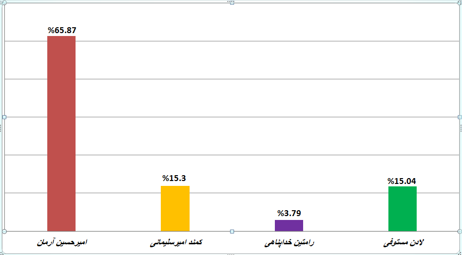 در این نظرسنجی همانطور که در تصویر بالا ملاحظه میفرمایید 65.87% به گزینه 1 یعنی «امیرحسین آرمان» رای دادهاند و وی به عنوان بهترین بازیگر سریال «پریا» به رأی مخاطبان آیفیلم انتخاب شد.